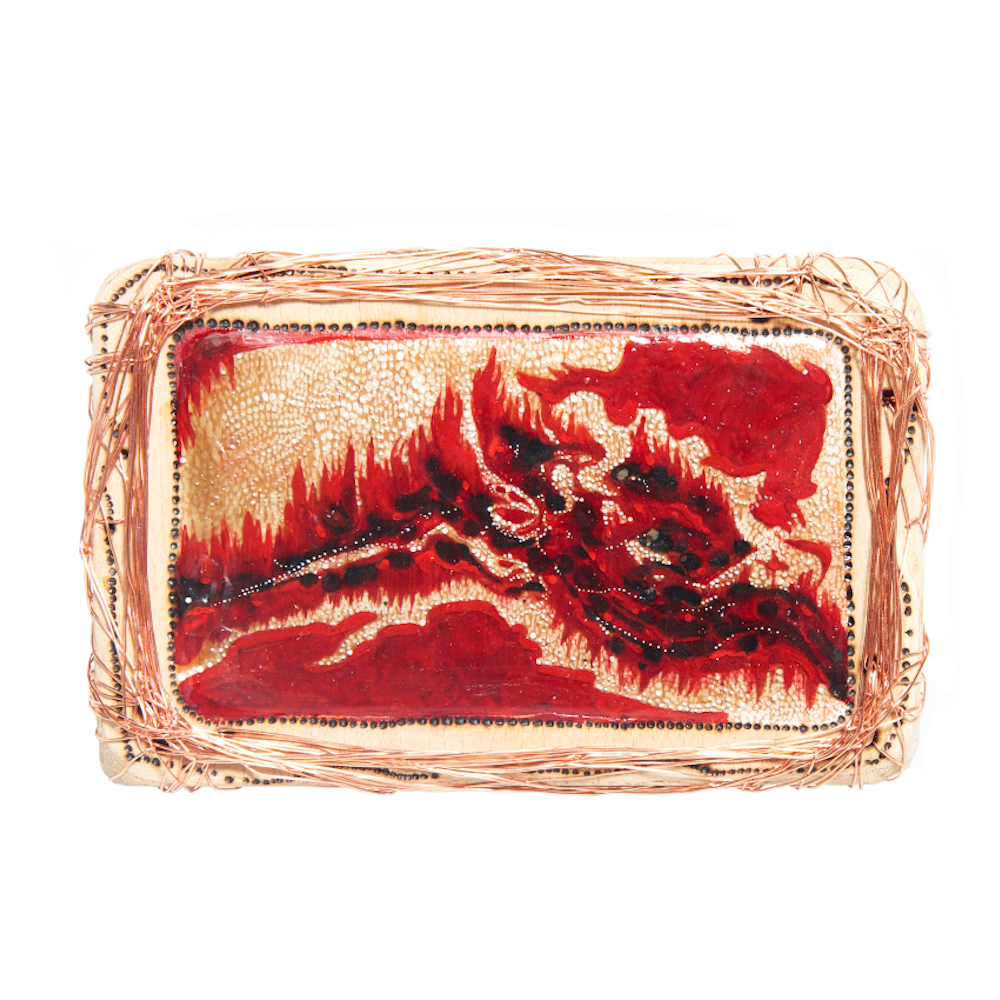 Oil on wood panel, decoratively burned, stitched with copper wire.