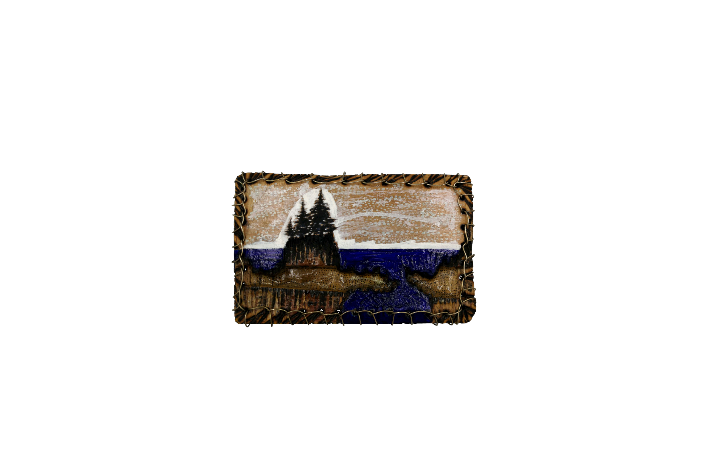Oil on wood panel, drilled and decoratively burned, stitched with sterling silver wire.