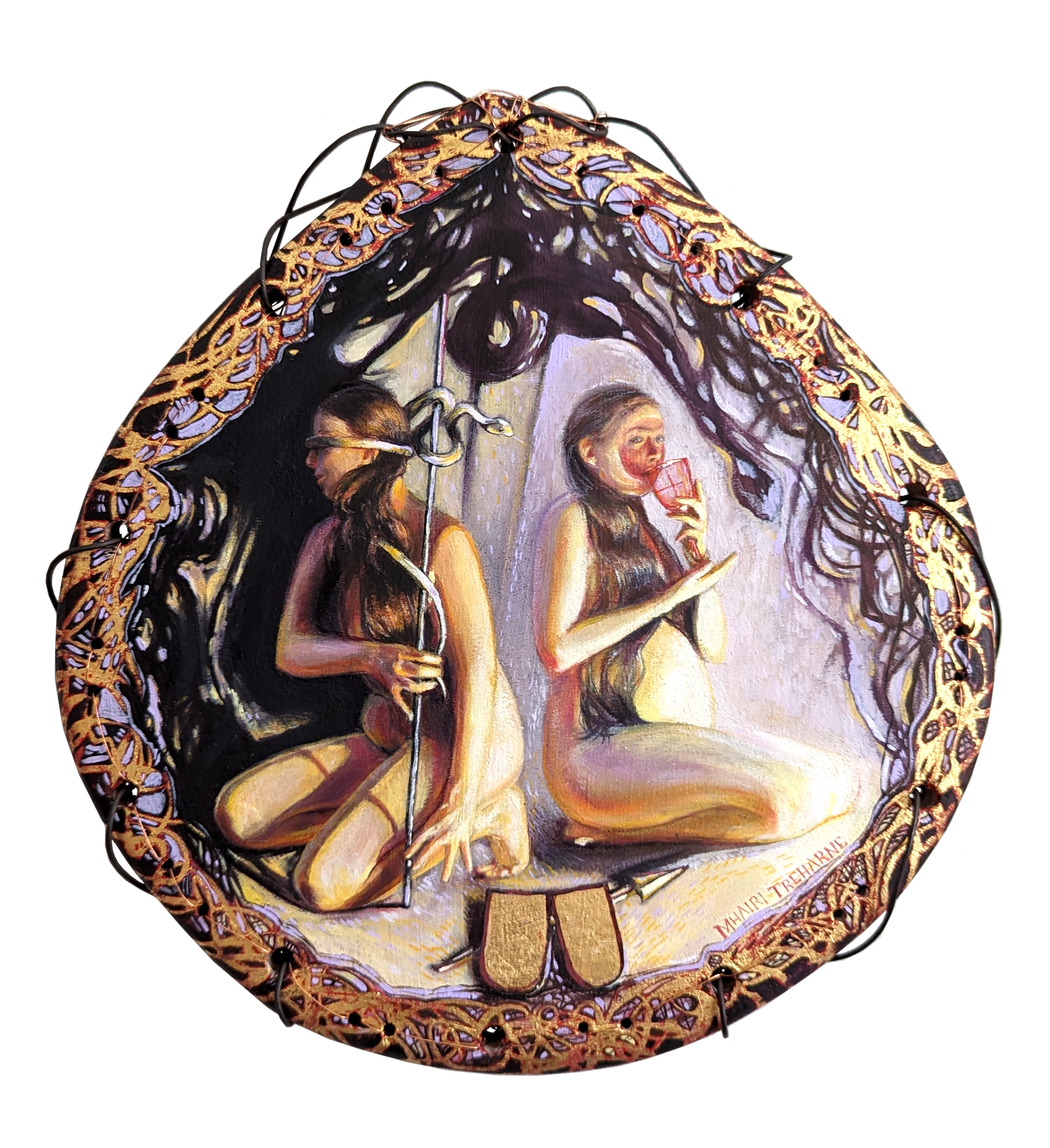 Oil on wood panel, drilled and decoratively burned, stitched with iron and copper wire, 22k gold leaf.